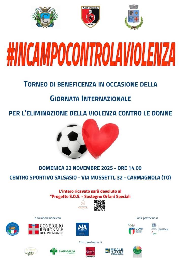 Domenica 23 novembre a partire dalle 14 nel centro sportivo Giorgio Demichelis di Salsasio in via Mussetti 32 a Carmagnola si sfideranno le squadre del Consiglio regionale, composta da referenti della Regione e del Consiglio Regionale, la squadra dei Sindaci del territorio e del Piemonte con le squadre femminili di Elledì FC, del Villastellone Carignano e del Moncalieri calcio.
